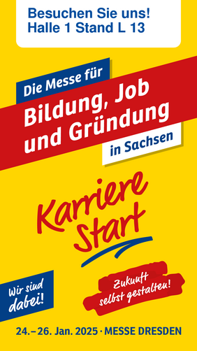 Unter dem Motto „Zukunft selbst gestalten“ findet vom 24. bis zum 26. Januar 2025 wieder die beliebte Bildungs- Job- und Gründungsmesse KarriereStart in der Messe Dresden statt. Besuchen Sie uns in Halle 1 an unserem Stand L 13 und erfahren Sie alles rund um unsere Ausbildungsberufe und aktuelle Job-Angebote. All Ihre Fragen rund um das Thema Ausbildung bei der SRD beantworten Ihnen an allen Messetagen sowohl unsere Personalmitarbeiter/-innen sowie derzeitigen Auszubildenden.